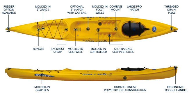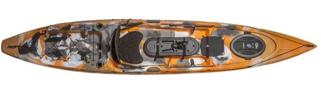 built as a fishing kayak, has rod pod to store rods up to 7′ 6″, evelution from the prowler 13